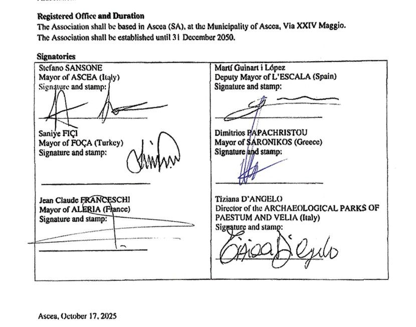 Gli Amministratori dei Comuni di ASCEA, FOÇA, ALERIA, L'ESCALA e SARONIKOS e la Direttrice dei PARCHI ARCHEOLOGICI DI PAESTUM E VELIA, al fine di costituire, in separata sede, l’Associazione “La Rotta dei Focei – The Route of the Phocaeans – ETS” e di sottoscrivere, come Soci Fondatori, lo specifico Atto costitutivo e Statuto allegato, convengono, in via propedeutica, di approvare il Protocollo di Intesa, contenente gli elementi fondamentali dello stipulando Atto costitutivo, che vengono di seguito riportati.