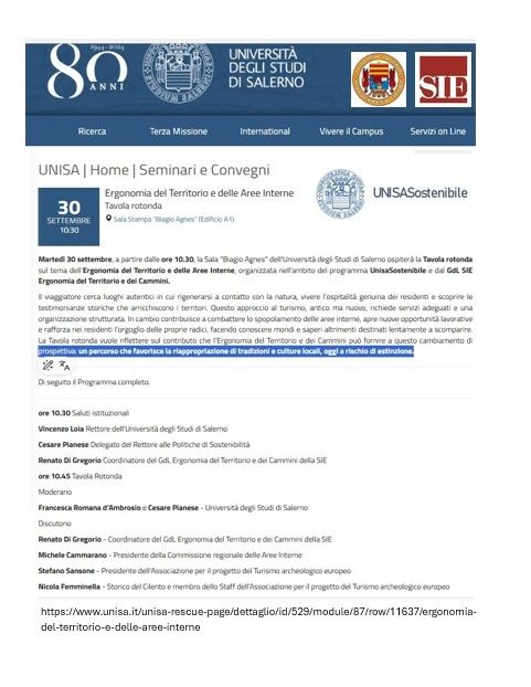 Si tiene presso l'Università di Salerno, il 30 settembre, mattina, una tavola rotonda sul tema Ergonomia del Territorio e Arre Interne, organizzata dalla prof.ssa Francesca Romano D'Ambrosio. Come relatori partecipano: Renato Di Gregorio, Michele Cammarano, Nicola Femminella e i docenti dell'Ateneo.